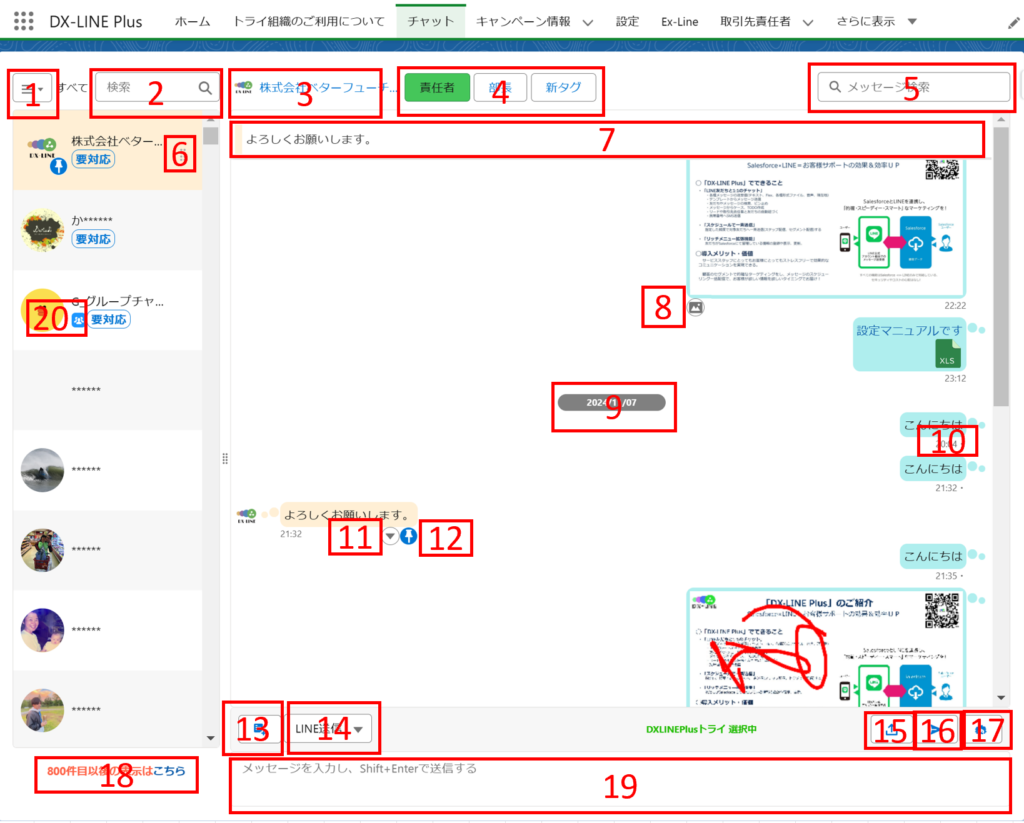 | 5 | メッセージの検索窓 チャット窓に表示しているメッセージのみ検索対象 上部にスクロールすると過去のメッセージが表示される |