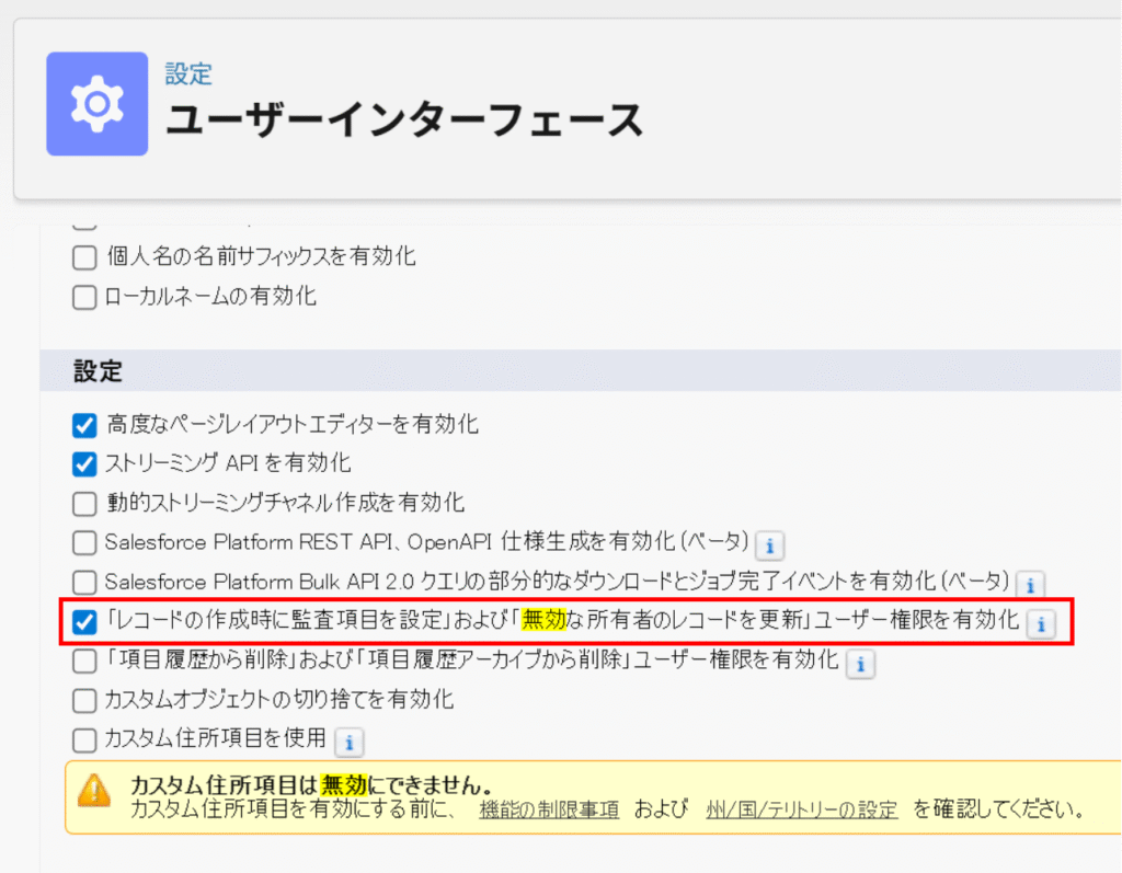 ②-1.「設定」ー>「ユーザーインターフェース」ー>「設定」ー>「レコードの作成時に監査項目を 設定」および「無効な所有者のレコードを更新」ユーザー権限を有効化にチェックする