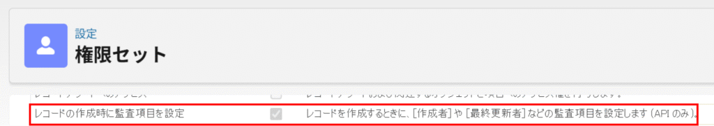 ②-2.「設定」ー>「権限セット」ー>「システム権限」ー>「レコードの作成時に監査項目を設定」をチェックして、導入用ユーザー(取り込み作業ユーザー)に割り当てる