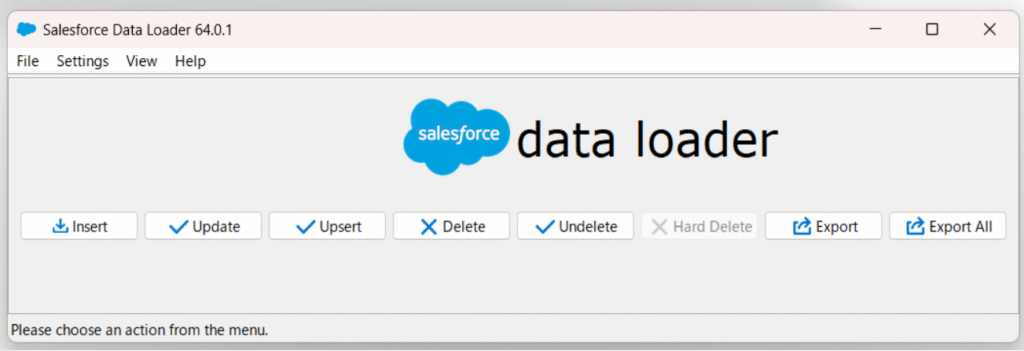 Insert(新規登録)、Update(更新)、Upsert(登録・更新)、Delete(削除)、Export(CSVファイルへの書き出し)Export All(CSVファイルへの全ての書き出し)の実行が可能