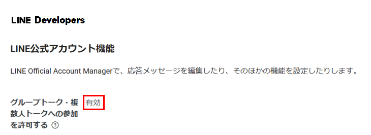 招待されるためには、LINE Developersコンソールのチャネル設定にある[Messaging API設定]タブで、[グループトーク・複数人トークへの参加を許可する]を「有効」にしておく必要があります。