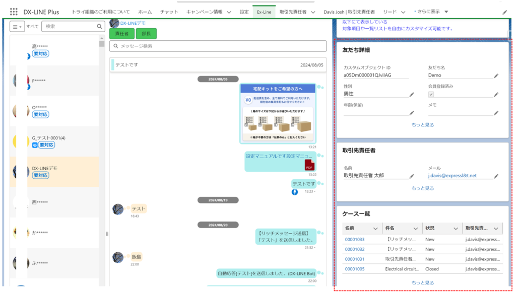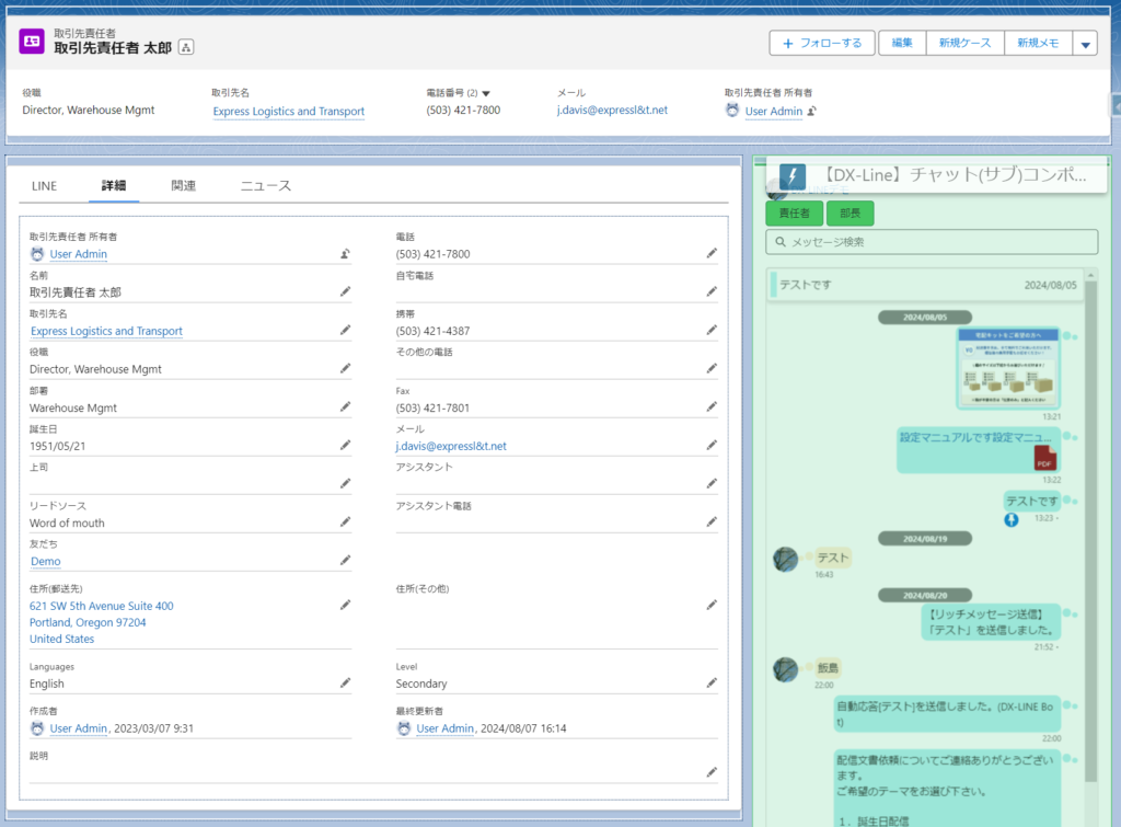 取引先責任者の詳細画面にて、DX-LINEコンポーネント「【DX-Line】チャット(サブ)コンポーネント」を配置した場合の画面説明です。