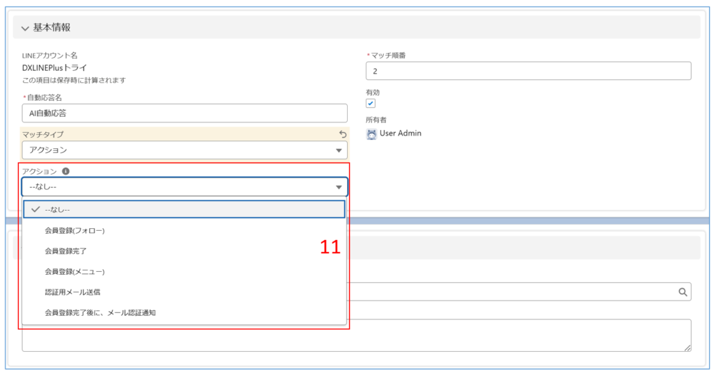 | 10 | アクションキー マッチ条件に成功した場合、任意の処理を起動させるため、ここに任意文字を入力したら、 Line処理コマンド(bfml__FmlInsertForNext__c)のレコード新規作成される。活用例を参照する |