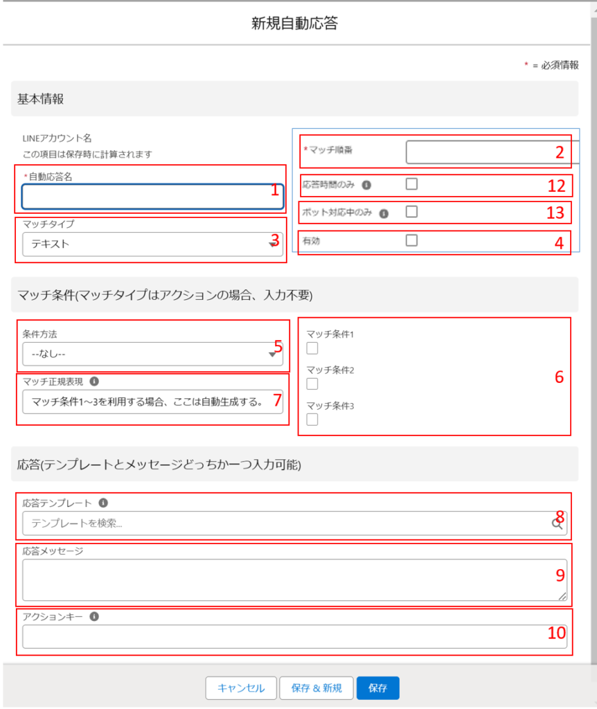 | 2 | マッチ順番 一つのメッセージに対して、一つの自動応答が可能。数字が小さい方が先にマッチする |