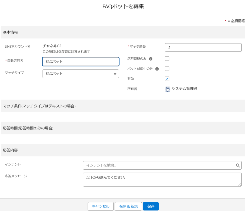・マッチタイプ: FAQボット(FAQに自動回答するチャットボット)