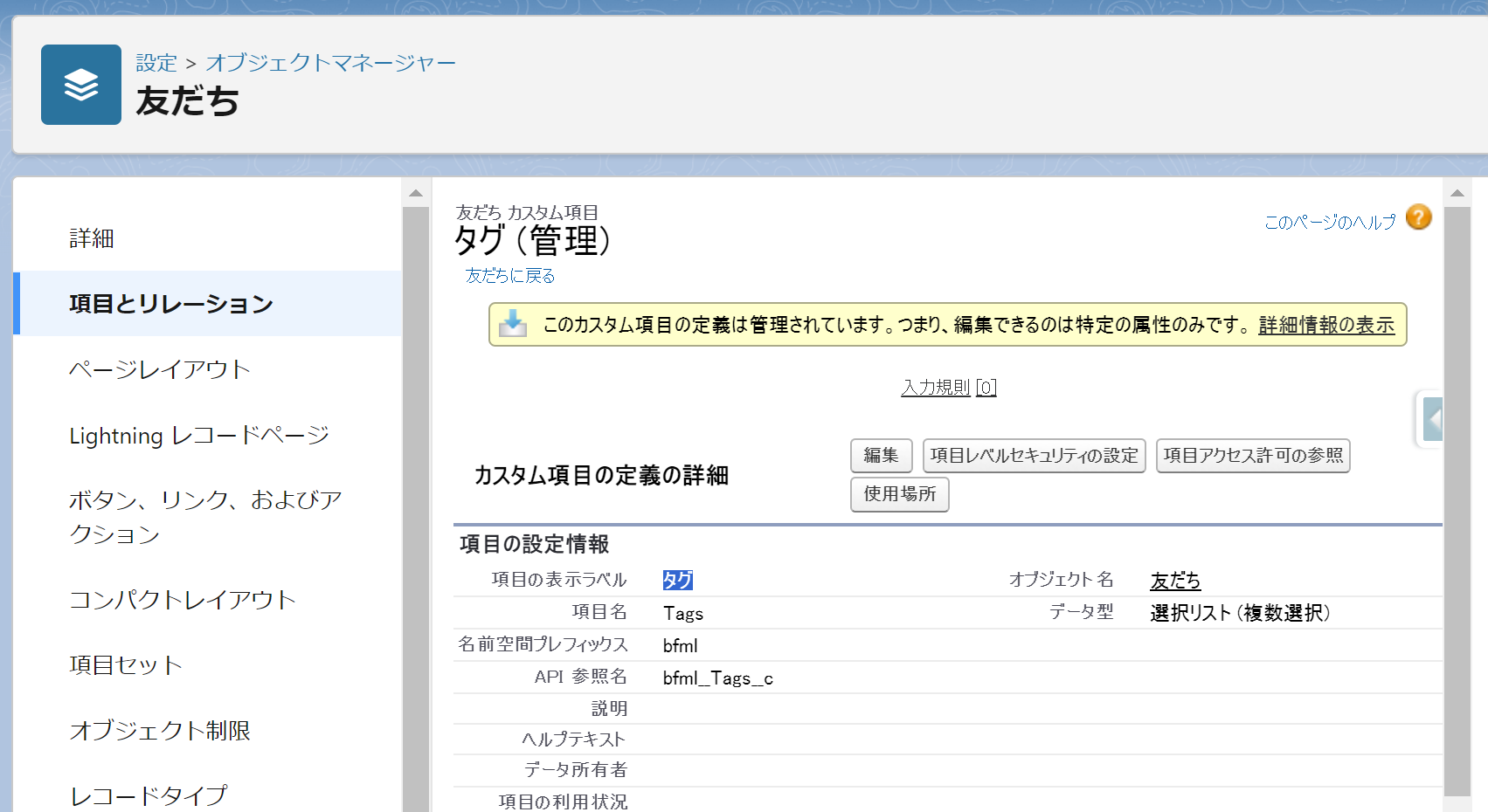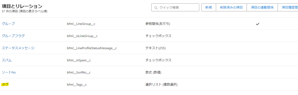 設定⇒オブジェクトマネージャー⇒友だち⇒項目とリレーション⇒タグ⇒値