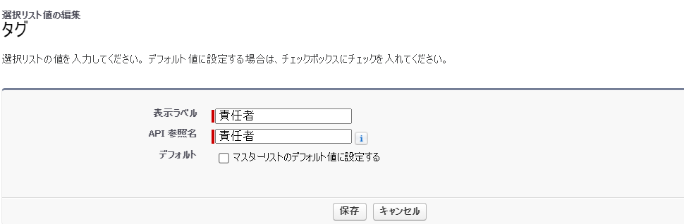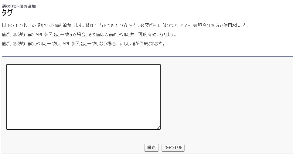 タグで「新規」の作成をする。(既存の選択肢を編集する場合、値とAPI参照名を両方同じように変更する必要があります)