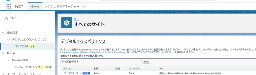 ①設定⇒機能設定⇒デジタルエクスペリエンス⇒すべてのサイト⇒フォーム公開対象のサイトの「ビルダー」の設定をする