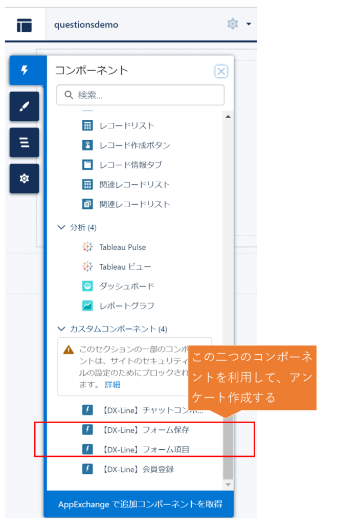 例: https://dxlinetestdrive-dev-ed.develop.my.site.com/dxline/s/questionsdemo