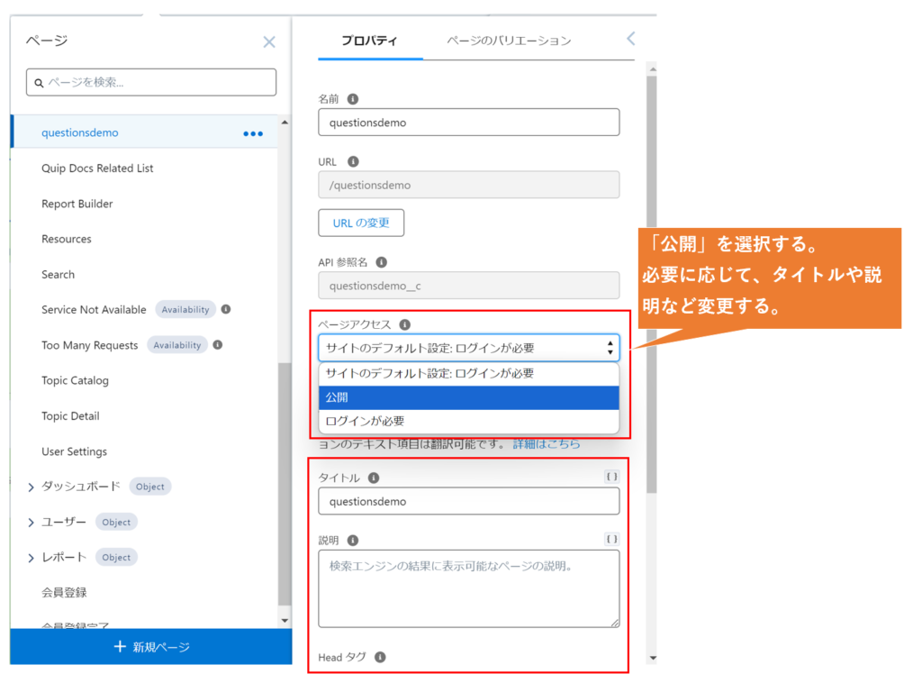 ④ページを公開に変更し、必要なタイトルなどを変更する