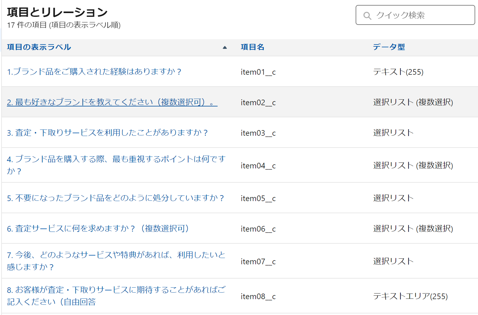 ※データ型は、すべてテキスト項目でも問題ない。テキストエリア、日付、選択リスト(複数、一つ)項目も可能