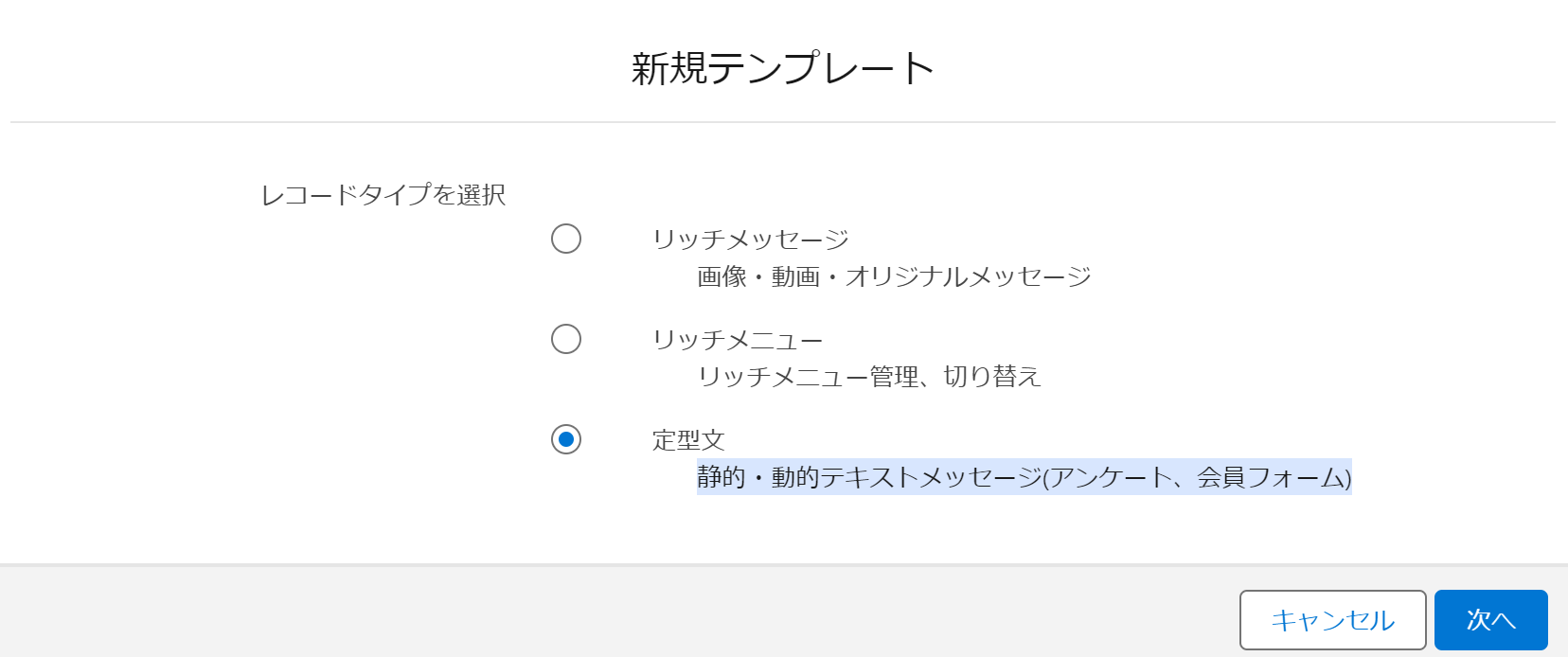 ①新規テンプレート→「定型文」を選択
