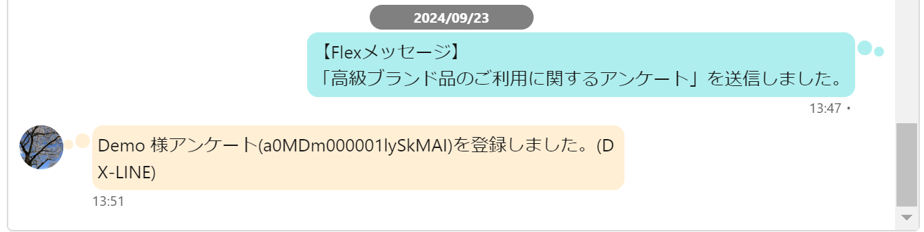 友だちが回答した場合「アンケート(レコードID)を登録しました。」と表示される