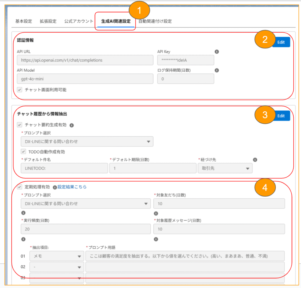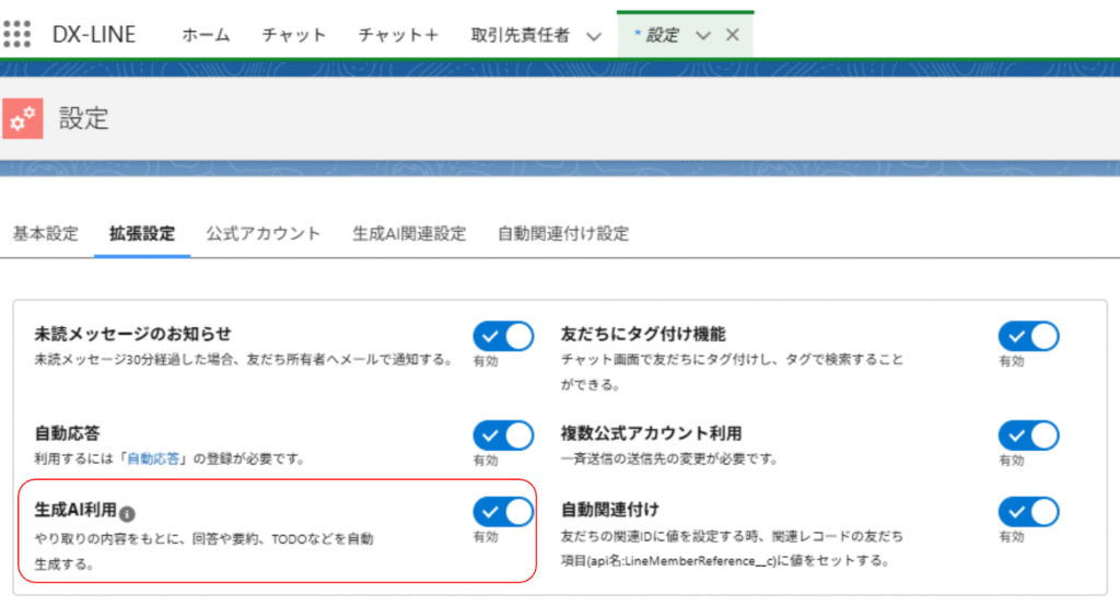 ① DX-LINE設定にて、「生成AI利用」を有効化し、「生成AI関連設定」タブへ遷移する