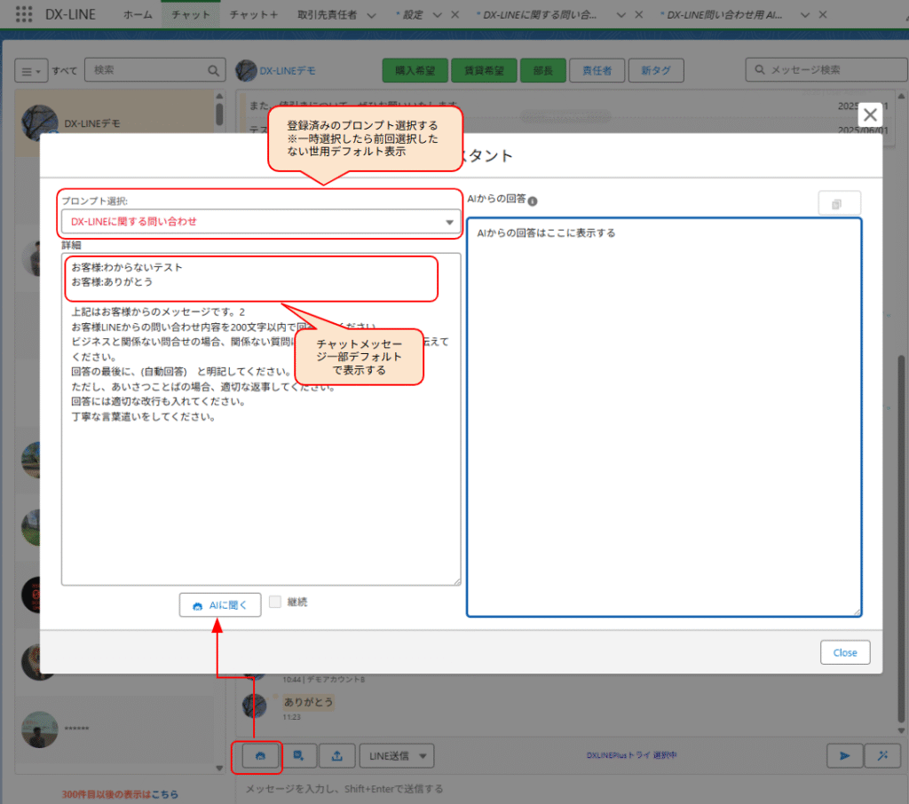 チャット画面のアインシュタインアイコンをクリックし、AIアシスタント画面を開く(ユーザの内容をここで編集することもできます)