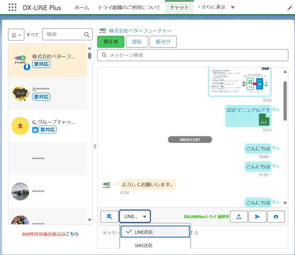 DX-LINE Plusのチャット画面にて「SMS送信」を選択し、メッセージを入力して送信する