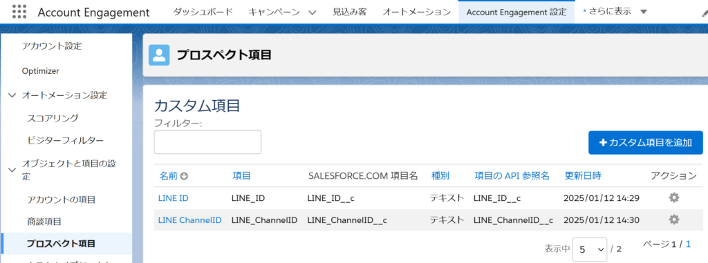 ➁Account Engagement設定⇒「プロスペクト項目」以下の2つの項目を追加する