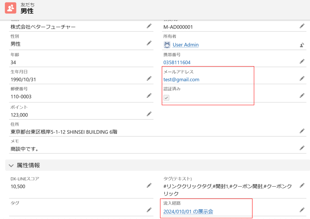 上記作成した「 QRCodeダウンロード」をクリックし、表示したQRコードから友だちフォローをもらうと、友だちレコードの以下の項目に値がセットされる
