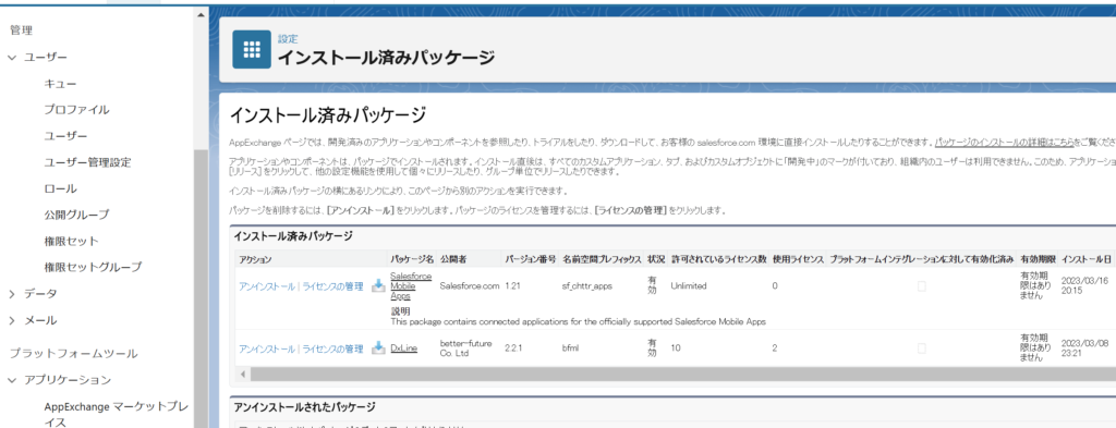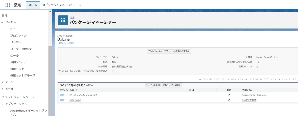 設定 ⇒ インストール済みパッケージ ⇒ DxLine の 「ライセンスの管理」ユーザを追加する
